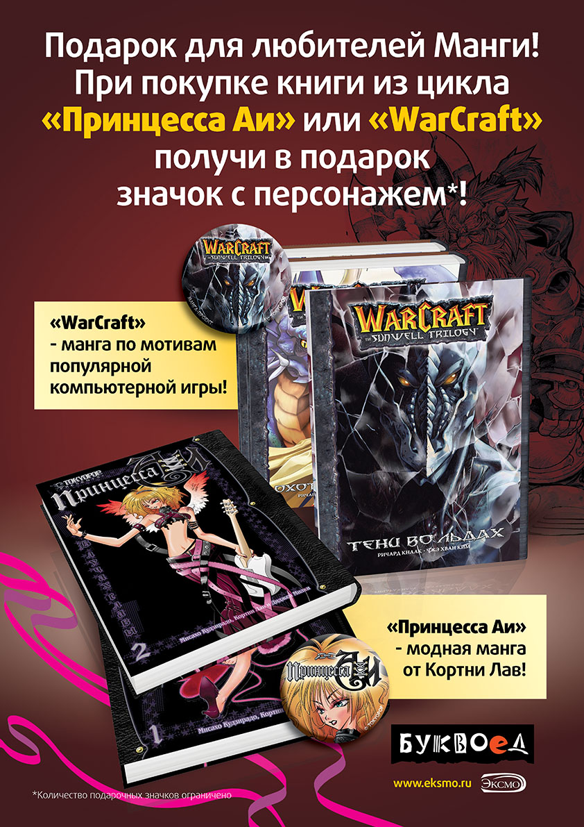 Здравствуйте! Насчет даты выхода - в издательство и Варкрафт, и Принцесса придут 22 апреля, то есть завтра. Бизенгаст и Сновидения придут немного позже. Но, что касается, появления в магазинах - тут сложнее. Из-за праздников и разного рода выходных они могут поступить к книготорговцам только в десятых числах мая. Но, будем надеятся, что все случится раньше. :unsure: Сами ждем - не дождемся. :unsure: Кстати, хорошие новости! Теперь, покупая WarCraft или Принцессу Аи, Вы получите подарок. Гарантировано значки будут выдаваться в Буквоеде и Новом Книжном, что же касается других книжных магазинов - здесь, к сожалению, ничего сказать не можем.