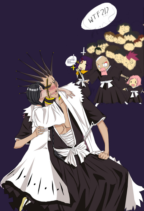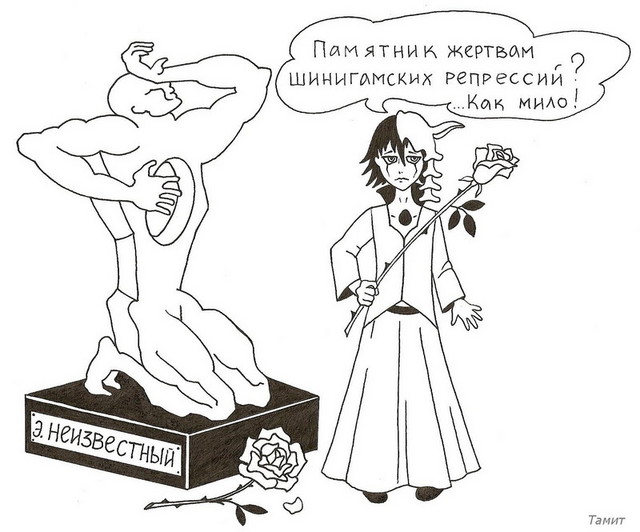 Это - так сказать, эксклюзив, нигде еще не было. Моя подруга придумала, а я с её разрешения выкладываю здесь. Надеемся, что понравится: "Нет, Айзен-тайчо, только не вас!" - У Хинамори ручьями слезы из глаз. Отважная Момо "врагам" отомстила - В Обществе Душ всех перебила. Тоусен к Гримму обратился: "Выход здесь?" - Гримм не смутился. "Да!" - отвечал слепому подлюка, В спину толкая к открытому люку. Гин решил по перилам скатиться - Очнулся тайчо на койке - в больнице - То Куротсучи ночью гулял, Гвоздиков 20 в перила загнал. "Бьякуя!" - голос раздался в тылу. "Слушаю" - тайчо ответил ему. "Рви, Забимару!" - последовал крик. После у Ренджи был черный парик. Ренджи думал, что очень крутой. "Тайчо, я вас вызываю на бой!" - Ичимару долго после смеялся - Абараи дней 7 без сознанья валялся.