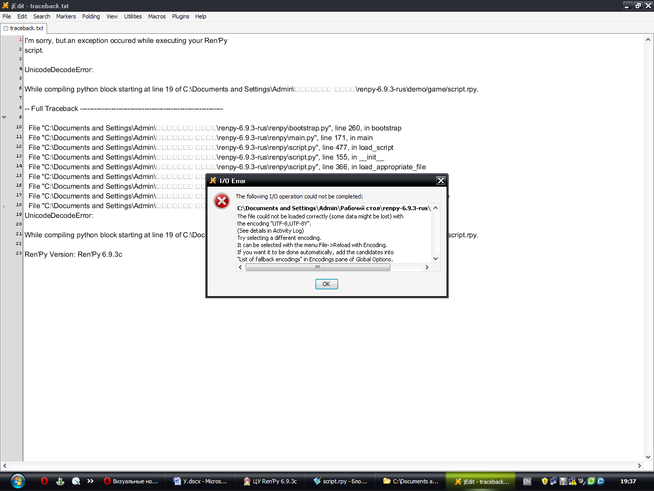 В той строчке как раз настройки окна. Скачала свежую версию РенПи - тот же результат. Когда перед этой строкой решетка, все нормально, но стоит ее просто убрать (или поменять значение) - как вылазит вот это. Уже не знаю что делать.