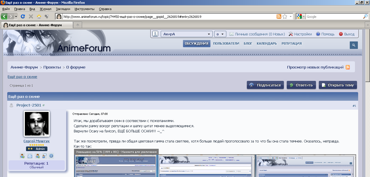 Итак, мы дорабатываем скин в соотвествии с пожеланиями. Сделали рамку вокург репутации и шапку цитат менее выделяющимися. Вернули Осаку на favicon, ЕЩЁ БОЛЬШЕ ОСАКИ!!! ~_^ Так же посмотрели, прввда ли общая цветовая гамма стала светлее, хотя больше людей проголосовало за то что бы она стала темнее. Оказалось, неправда. Как-то так: http://animeforum.ru/old/af.png Думаем: - затемнить шрифт для списка тем - сделать голосования не зелёными, что бы они не сливались с закрепленными темами А теперь о главном, зачем эта тема и чем она лучше старой? В той теме много флуда, поэтому делаем новый формат. Правила: 1. В этой теме каждый желающий высказывает своё предложение по элементам или концепции дизайна. 2. 1 сообщение = 1 предложение. Если у вас более 1 предложения, пишите по 1 сообщению на каждое. Это сделано, что бы сделать возможным голосование за отдельные предложения посредством системы оценки поста (см. пункт 6.). 3. От каждого участника принимается не более 3 различных предложений. 4. Если предлагаете что-то поменять, то на что-то конкретное, а не просто так. Предложения, в которых что-то не нравится, но не предлагается, как это исправить, не принимаются. 5. Любые сообщения, не содержащие предоложения по изменению стиля (или содержащие предложения, не относящиеся к дизайну и CSS, а, например, к движку форума) и опубликованные в данной теме будут караться RO на 2 недели. 6. Данная тема считается голосованием, для голосования за предложения используем репутацию (оценку сообщения). Голосуем активнее, малое число голосов показывает, что всем всё нравится. 7. Если вам чьё-то предложение кажется неправильным, не спорьте с ним (это запрещено правилами темы), внесите своё предложение с обратным смыслом и история рассудит, кто был прав. 8. Обещаем прислушаться к мнению общественности и реализовать часть предложений, которую посчитаем наиболее адекватной и которую сможем реализовать технически. Говоря простым языком, мы не гарантируем реализацию предложений с наибольшим рейтингом, но шанс на это достаточно велик.