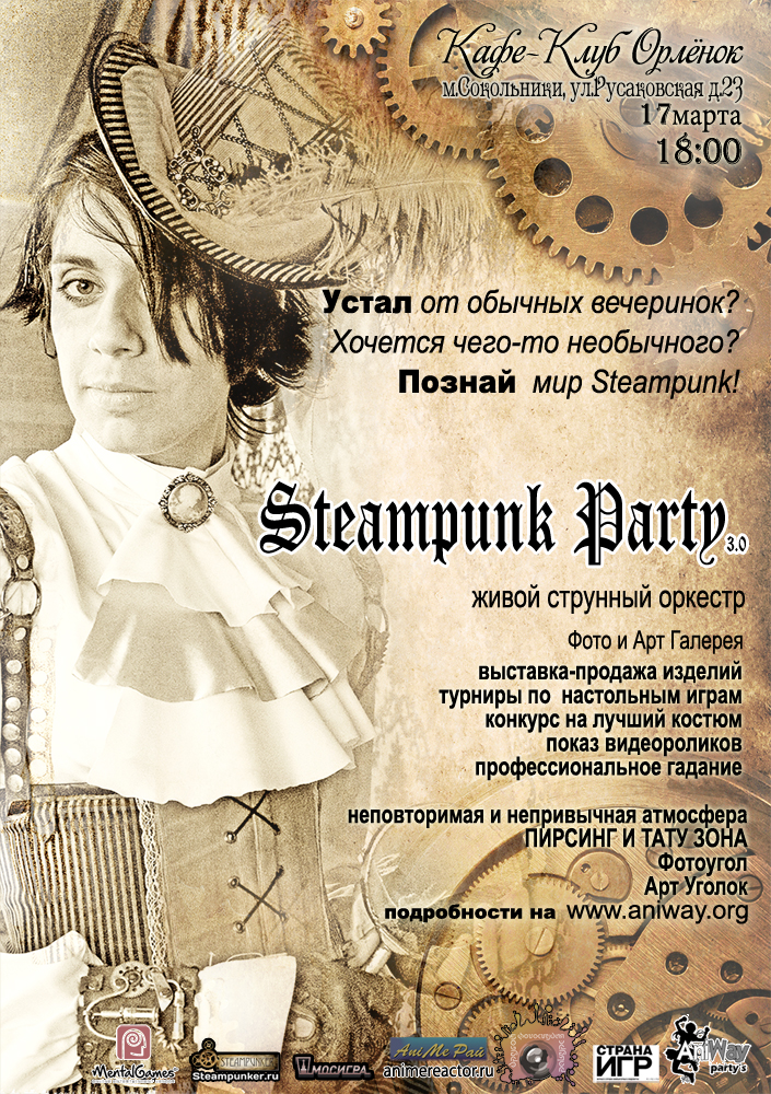 от СОЗДАТЕЛЕЙ вечеринкок ANIWAY www.aniway.org: НАДОЕЛИ ОБЫЧНЫЕ ВЕЧЕРИНКИ? ПОЗНАЙ STEAMPUNK МИР! Steampunk Party 3.0 STEAMPUNK (Стимпанк) — жанр фантастики, действие которого происходит в мире, где главенствуют технологии паровых машин, заменивших электронику. ВНИМАНИЕ! вход строго лицам от 16-ти! ДРЕСС-КОД: в вечерних платьях, костюмах, можно в черных и белых рубашках или в антураже steampunk направления. STEAMPUNK PARTY это: — Живой струнный оркестр — ВЫСТАВКА — ПРОДАЖА эксклюзивных ручных работ мастеров в стиле Steampunk — ОБУЧЕНИЕ ТАНЦАМ Викторианской эпохи — ТУРНИРЫ по шахматам и настольным играм от МОСИГРЫ www.mosigra.ru — Конкурс на лучший Steampunk костюм — Фото и Арт Галерея — Арт Уголок (ВЫ можете открыть в себе таланты)* — НЕОБЫЧНЫЕ конкурсы — Показ лучших клипов и видеороликов данного направления — Неповторимая и непривычная АТМОСФЕРА — ПИРСИНГ И ТАТОО ЗОНА от KAKTUS TATTOO vkontakte.ru/club14568352 — Мастер необычных причесок Eva Kramer vkontakte.ru/id2327483 — Профессиональное гадание — Фотоугол * Арт уголок — место, в котором любой посетитель может воспользоваться карандашами и красками и попробовать нарисовать шедевр вместе с мастером. Ведущая — HONO & Danil НА СЦЕНЕ: Dee, NANAMI feat. AMAYA 8, Molli Worldy, Lisandra, Miaka Танцевальная группа Febris Erotica и Завораживающие танцы от Изуми СЮРПРИЗ от ЭПОХИ ТАНЦЕВ Живой звук: ЖИВОЙ АРКАНУМ группа 108НОТ ГРАНИ Durandal PRIMO квартет DJ MadDoctor Цена билета: ПРЕД ПРОДАЖА — 370р. Бронь на сайте www.aniway.org — 450р. В ДЕНЬ МЕРОПРИЯТИЯ — 600р. ______________________________________ БИЛЕТЫ МОЖНО ПРИОБРЕСТИ: м. Пражская, тц «Электронный Рай», павильон 1В-20 и 1Г-4 МАГАЗИН АНИМЕ РАЙ (БИЛЕТЫ В ПРОДАЖЕ С 23 ФЕВРАЛЯ ) ПОЛУЧИТЬ БРОНЬ МОЖНО В ДЕНЬ МЕРОПРИЯТИЯ. ВНИМАНИЕ! КОЛИЧЕСТВО БИЛЕТОВ ОГРАНИЧЕНО! ______________________________________ По всем вопросам организации, участия и сотрудничества обращаться — tooniegirl@mail.ru Местоположение: Кафе-Клуб Орлёнок, м.Сокольники, ул.Русаковская д.23 Начало: 17 марта в 18:00 http://www.youtube.com/watch?v=eMC45fMDv2g&feature=player_embedded