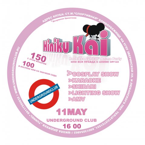 Итак, свершилось, вторая, долгожданная вечеринка АА клуба. Вы этого ждали. Первая вечеринка никого не оставила равнодушным. На нашей абсолютно новой пати мы обещаем вам ещё больше драйва, ещё больше шоу, ещё больше хорошей музыки. 11 мая, в 16 часов, всё начнётся в новом, огромном клубе Санкт-Петербурга "Underground" (undergroundclub.ru) Это нельзя пропустить. Специально для вас, мы создаём абсолютно новую вечеринку "Hiniku Kai" что с японского переводится как "Безумная, сумасшедшая и циничная вечеринка" почему циничная спросите вы, да потому что только мы покажем вам всю правду о Питерских аниме оргах, только у нас, вы узнаете о чём они думают, что творится в их головах когда они делают для вас очередное мероприятие и прочие скрытые мысли и желания. Ну почему сумасшедшая обьяснять не нужно. Два танцпола с лучшими звуковыми системами Turbosound и множество современнейших световых приборов создадут для вас неповторимую атмосферу. Мы же берём на себя всё остальное, в этот вечер для вас будет: 1. Новая уникальная косплей постановка от коллектива "Бугогаки Мухохами" 2. Выступление лучших караокеров с лучшими хитами 3. Излюбленное всеми шибари шоу от Хаппосая, такого нет больше ни у кого 4. Феерическое лайтинг шоу 5. Anime Music Video (AMV) на большом экране 6. Как всегда зажигательные и необычные конкурсы 7. Впервые, аниме номинации на звание самых колоритных личностей определённой направленности Этот вечер для вас будут вести уже полюбившиееся вам ведущие, которые по собственному опыту знают как вас развеселить, скучно точно не будет никому. За пультом для вас будет стоять наш диджей, будут играть как старые полюбившиеся вам хиты, так и новую экспериментальная японская музыка, которая до этого не звучала ни на одной аниме вечеринке. Стоимость входа: С флаером---------------------150 рублей В косплее*--------------------100 рублей Всем остальным:-------------200 рублей Акция: "Возьми Сида с собой" Всем предьявившим значок АА клуба, стоимость входа снижается до 100 рублей, независимо от наличия косплея или флаера ВСЕМ КТО ПРОХОДИТ СО СКИДКОЙ (косплеерам и владельцам значка АА клуба) Вы должны получить на входе контромарку, подтверждающую что вы проходите со скидкой у специального работника. Предупреждаем заранее, гардероб платный и стоит 50 рублей, но с ним проблем не должно быть, так как сейчас уже почти лето. *Протекторы "наруто" и неко мими** кослеем не считаются!!! **Но кавайных девочек в неко-ушках мы всё равно любим и ждем^^