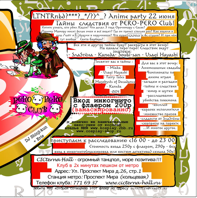 LTNTRnbd?***?_*/?)^_? Anime pati 22 июня Тайны следствия от PERO-PERO Club! Вход инкогнито с флаером 200р Хотите узнать кто убил Кадзи? Что делал 3 года Орочимару с Саске? Как проходят месячные у Ранмы? Почему Мамуро носит белые очки и всё видит? Где он прячет столько роз? Как ходили в душ Лайт и Л будучи в наручниках? Что курит Гайнакс и 4с студия? Что делать если вместо руки девочка? Почему миса-миса не дура-дура? Кого победил человек-молекула? Почему Лина Инверс не толстеет? Что стало с Люси? Куда ушли 3 самурая? Зачем Усаги держит пальцы веером? Куда в итоге делась утена? Как устроен покебол? Почему в хентае девушки такие мокрые? Каким дезодорантом пользовался Ваш в пустяне? И при чём тут вообще Санта-барбара Все эти и другие тайны будут раскрыты в этот вечер! На канале перо-перо! Следствие ведут знатоки: - SлаSтёна - Kaneda - Soubi-san - Usagi Hayashi - DJ Shinji-kun + Erie Посвятят вас в тайны : - Miaka - Usagi Hayashi - Fairy Tales - Mazohysts of Decadance - Kaneda Для вас в этот вечер: -Чемпионаты по аниме играм -загадки и разгадки -тайны и следствия -юмор и шутки -косплей -выбор самого анонимного инкогнито -караоке исполнители -множество призов -сладости от SлаSтёны -сюрпризы на паркете -расследование убийства покемона ...И многое другое. и конечно же новая коллекция замечательных неко-ушек от косплей ателье МИФ www.kosplay.2bb.ru www.cosplay-shop.ru приступаем к расследованию с16 00 - до 23 00 Стоимость входа 250р с флаером, 290р - без вход в инкогнито(маскировка или костюм детектива) скидка 50р! Клуб в 2х минутах пешком от метро Клуб CICterna Hall - огромный танцпол, море позитива!!! Адрес: Ул. Проспект Мира д.26, стр.1 Станция метро: Проспект Мира (кольцевая) Телефон клуба: 771 69 37 www.cicterna-hall.ru