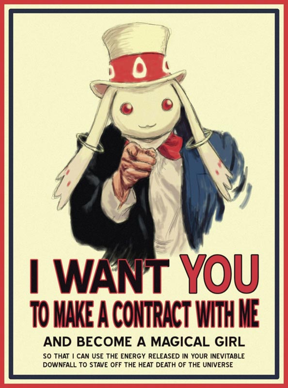 Ну а Кьюбей и интересы землян - ему изначально насрать на интересы землян, у него есть норма выработки энергии - вот и всё. А про то, что это может быть в интересах человечества - наглая ложь, чтобы Мадока так не ломалась.